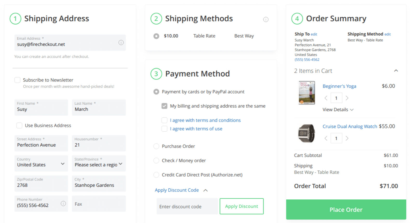 You can change checkout page layout from default 2 columns to 3 columns or 1 column. Heading background and order button color can also be changed directly here without editing css file.