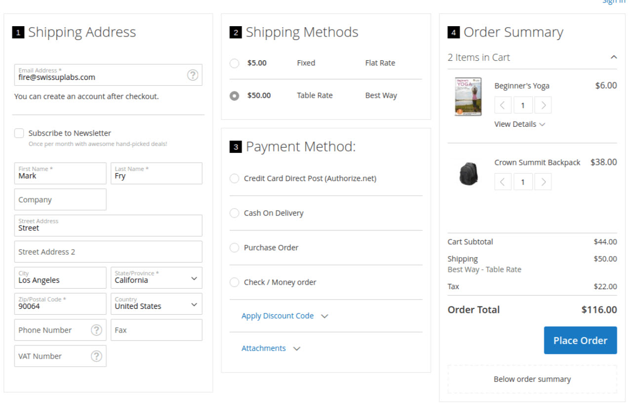 In Magento 2, the built-in checkout page was optimized much better compared to checkout page in Magento 1. Checkout steps in checkout page were reduced from 6 steps to only 2 steps and the load speed of checkout page was improved significantly.